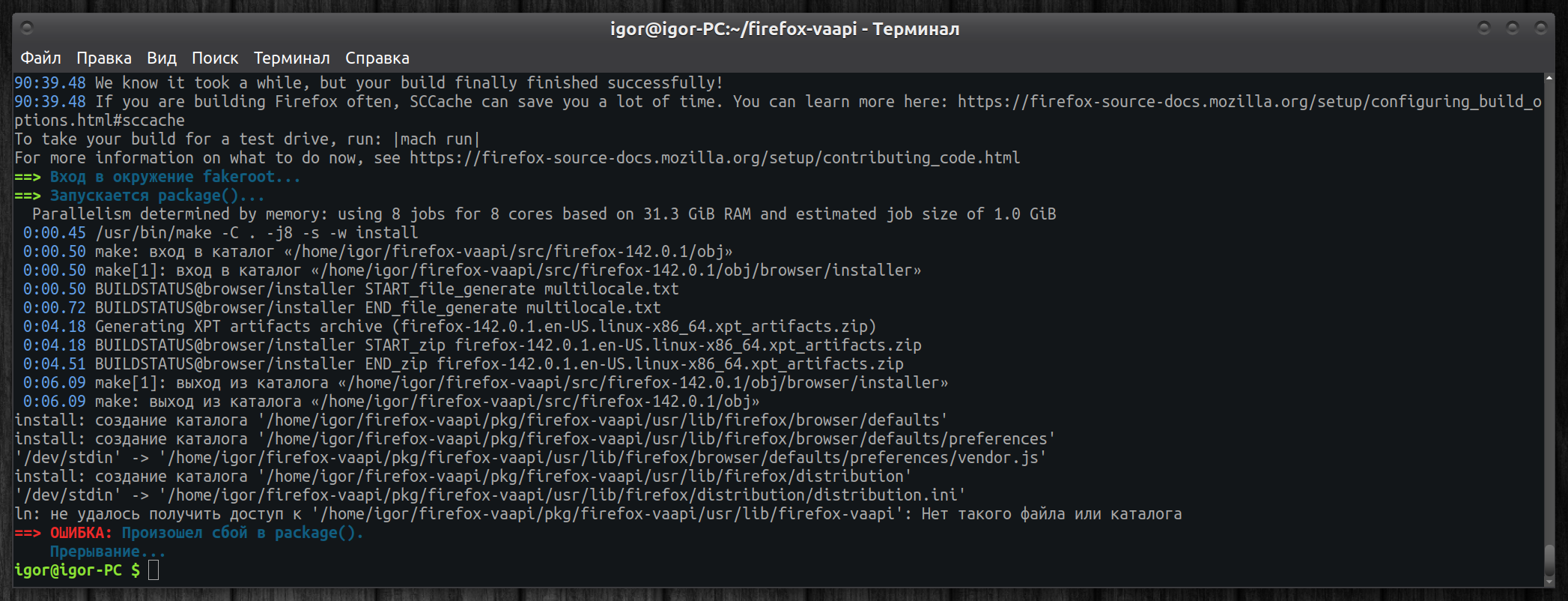 The message may slightly vary as I installed python311 after my first failed build; without it, the message stating to run mach on python311 doesn't show up.